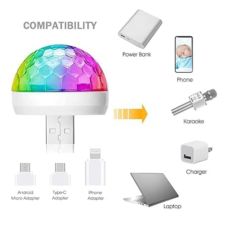 - Plug and Play – 4 power supply methods. Comes with USB port, Android adapter, Tapy-C adapter, LED disco ball can be used for smartphones and all USB output ports such as power bank, portable charger, computer, karaoke etc.